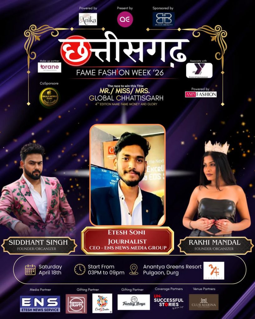 इस भव्य आयोजन की मीडिया कवरेज के लिए ENS News की सीईओ इतेश सोनी और ENS ब्यूरो रिपोर्टर जगन्नाथ बिसोई विशेष रूप से उपस्थित रहेंगे। उनकी मौजूदगी में फैशन वीक की सभी प्रमुख झलकियों और गतिविधियों की विस्तृत कवरेज की जाएगी, जिससे यह आयोजन और भी चर्चा का केंद्र बनेगा।