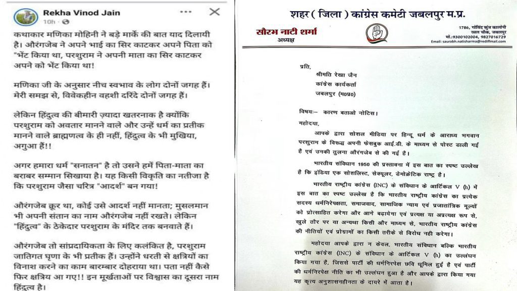 मध्य प्रदेश,के जबलपुर जिले की एक महिला कांग्रेस नेता रेखा विनोद जैन को सोशल मीडिया पर हिंदू देवता परशुराम की तुलना मुगल शासक औरंगजेब से करने के लिए कारण बताओ नोटिस दिया गया है। जबलपुर शहर कांग्रेस अध्यक्ष सौरभ शर्मा ने नोटिस जारी कर 48 घंटे के भीतर जवाब मांगा है। रविवार को जारी कारण बताओ नोटिस में कहा गया है, “आपने अपने फेसबुक आईडी के जरिए सोशल मीडिया पर हिंदू धर्म के देवता परशुराम के खिलाफ पोस्ट किया है और उनकी तुलना औरंगजेब से की है… आपने न केवल भारतीय संविधान बल्कि कांग्रेस पार्टी के संविधान का भी उल्लंघन किया है , जिससे पार्टी की धर्मनिरपेक्ष छवि धूमिल हुई है।