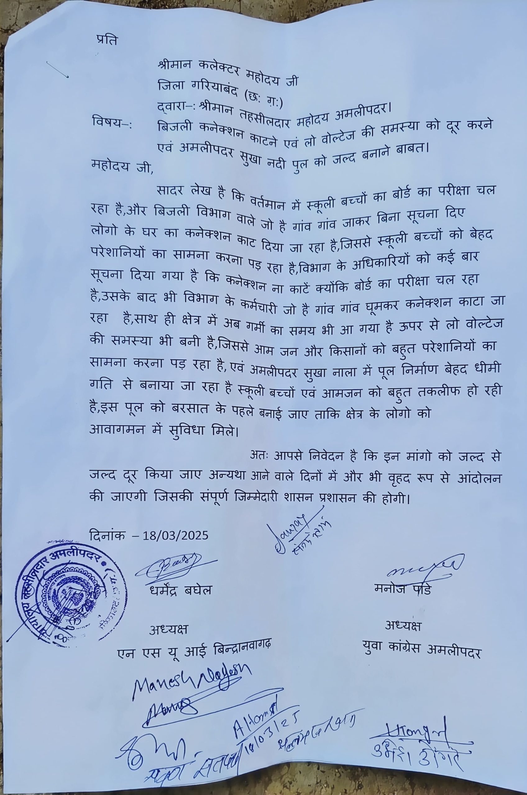 प्रदर्शन के दौरान यूथ कांग्रेस और एनएसयूआई कार्यकर्ताओं ने रैली निकालकर प्रशासन के खिलाफ नारेबाजी की और तहसीलदार अनिल भोई को ज्ञापन सौंपा। ज्ञापन में बिजली कनेक्शन बहाल करने और लो वोल्टेज की समस्या के समाधान की मांग की गई।